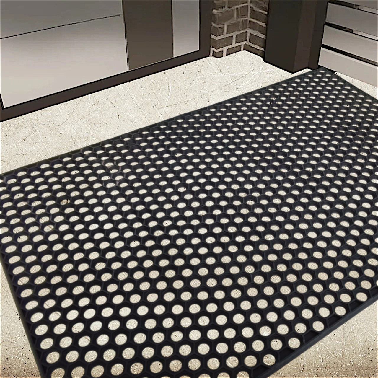 Килимок гумовий придверний Сота 100х140 см поєднує стиль і практичність. Цей килимок ефективно затримує бруд та вологу, захищаючи ваш будинок та надаючи вашому входу унікальний акцент.